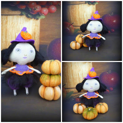 Маленькая ведьмочка. Использована новая выкройка Тильды из осенне - зимней коллекции 2015 -2016 года Sweetheart Doll (Милая кукла). Высота со шляпкой 15 см, высота тела 12 см. Материал - бязь, шерсть мериноса, фатин, пряжа хлопковая, немецкий хлопок, фетр.